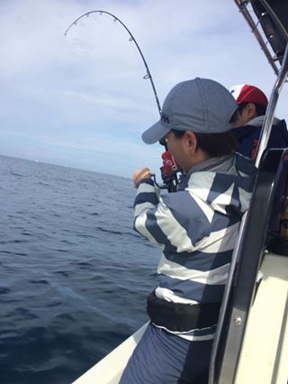 2年前に連れいってくださったHさんに先に席を取っていただいていたので、トモでやれることに。初心者だけにもしまわりに迷惑かかったらマズイなと思っていたのでひと安心。反対側のトモには釣り友Sちゃん。ジギング経験者だけに心強い〜(そして移動時にはおしゃべりができる特典もあり)