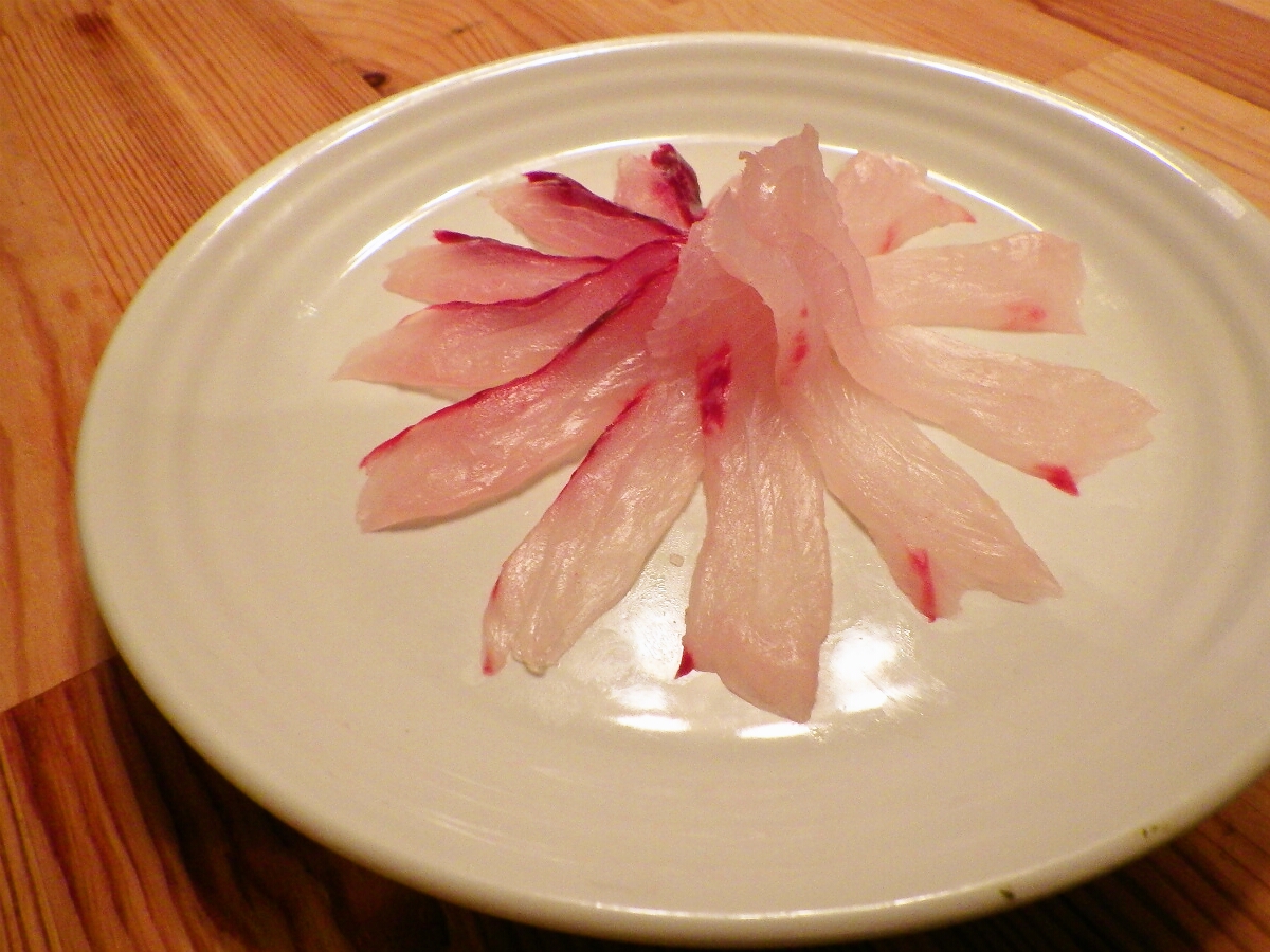 まずはシンプルに刺身で。弾力の中に甘みを感じる身が美味い(*´艸`*)臭みが全く無い!と書いたらウソになりますが、醤油でいただく時には全然気になりませんでした。