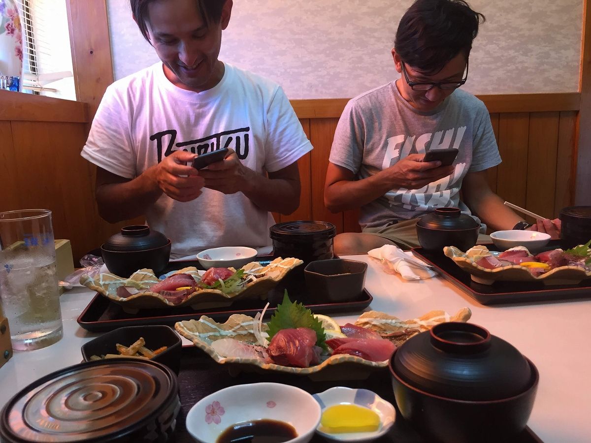 さっきまで海で釣りして、ブリの幼魚のヤズとか釣ってて、夜も同じような魚を食べるはずなのに、、、美味しそうなお刺身を前にするとインスタ映えする写真を撮っちゃうわけで(*´∀`*)