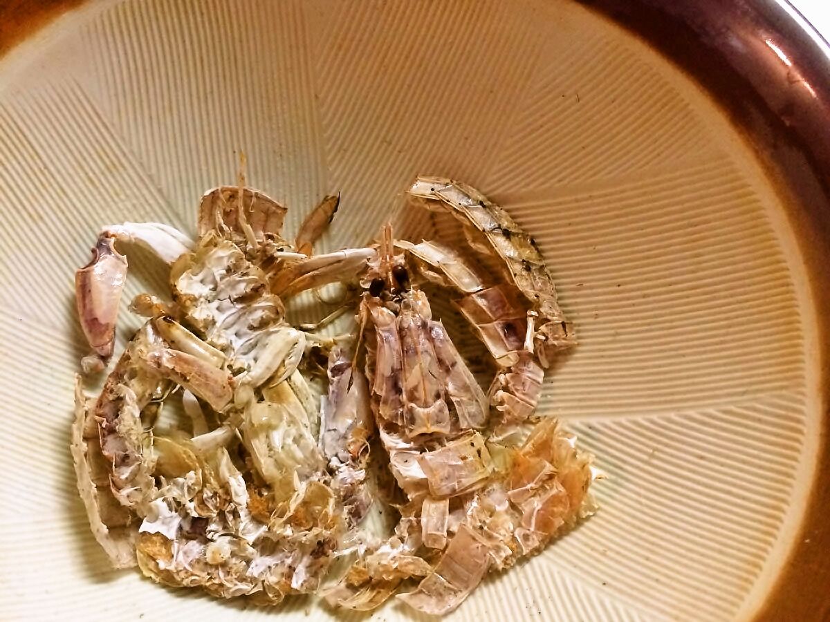 ある甲殻類の殻をむいて、水気を抜くために弱火で乾煎りして・・・