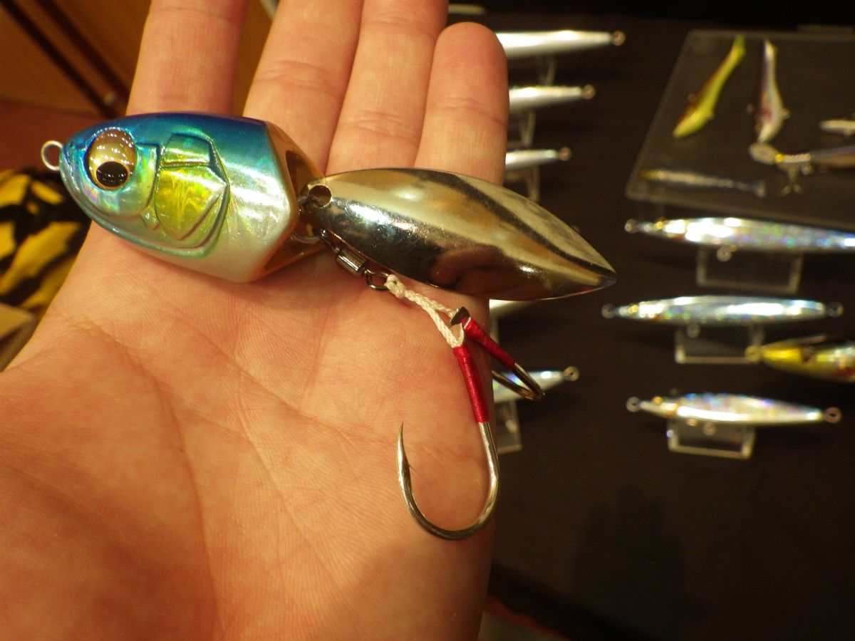 そのすぐ下にはこんな小さなルアーが!!下のは鉄板っぽいルアーなのですが、ストレートフックがビルドインされている感じ。こういうユニークなデザインのルアーを見れるのはショーならではの楽しみですね(*´艸`*)