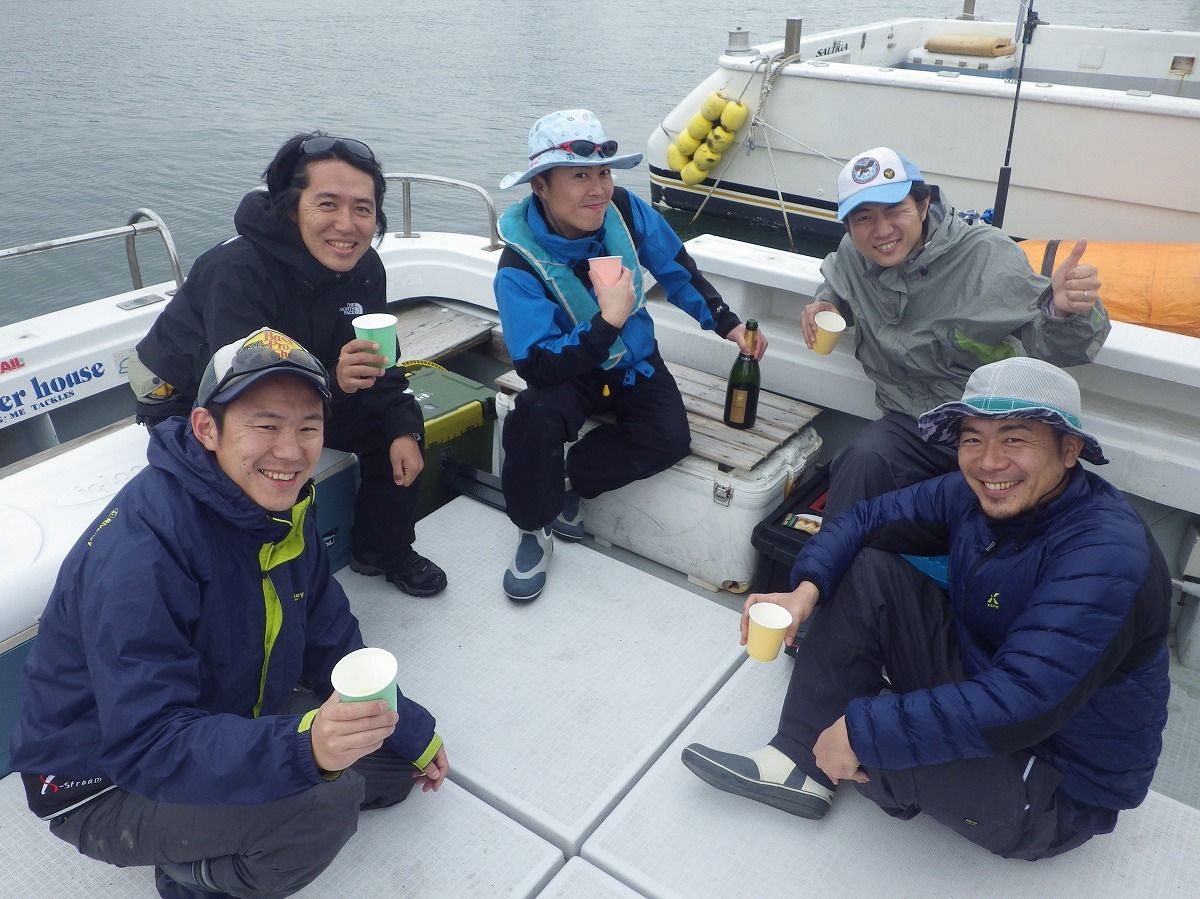 今回のメンバーは右から逆時計周りに、安川先生(詳細)、近藤先生(詳細)、荻野先生、齊藤部員、居酒屋村上の5人で、この人数で一隻をチャーターするというなんとも贅沢な釣行なのです(*´艸`*)