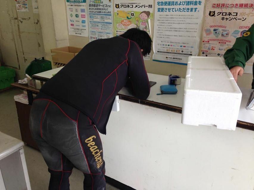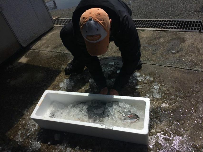 対馬さんのウェットスーツ姿から、魚を少しでも良い状態で送ってあげよう!!という、釣った魚への愛がこの写真からも感じられます( ・´ー・`)イッチャイナヨ