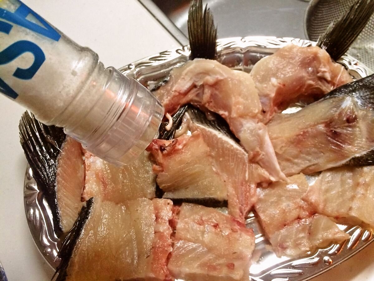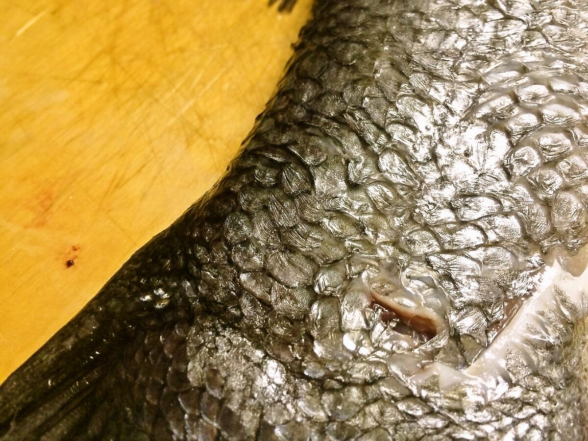 鯉のウロコみたいに分厚いヒラスズキのウロコは、揚げても炒めても固そうなので今回は廃棄(-д-;)スマセン