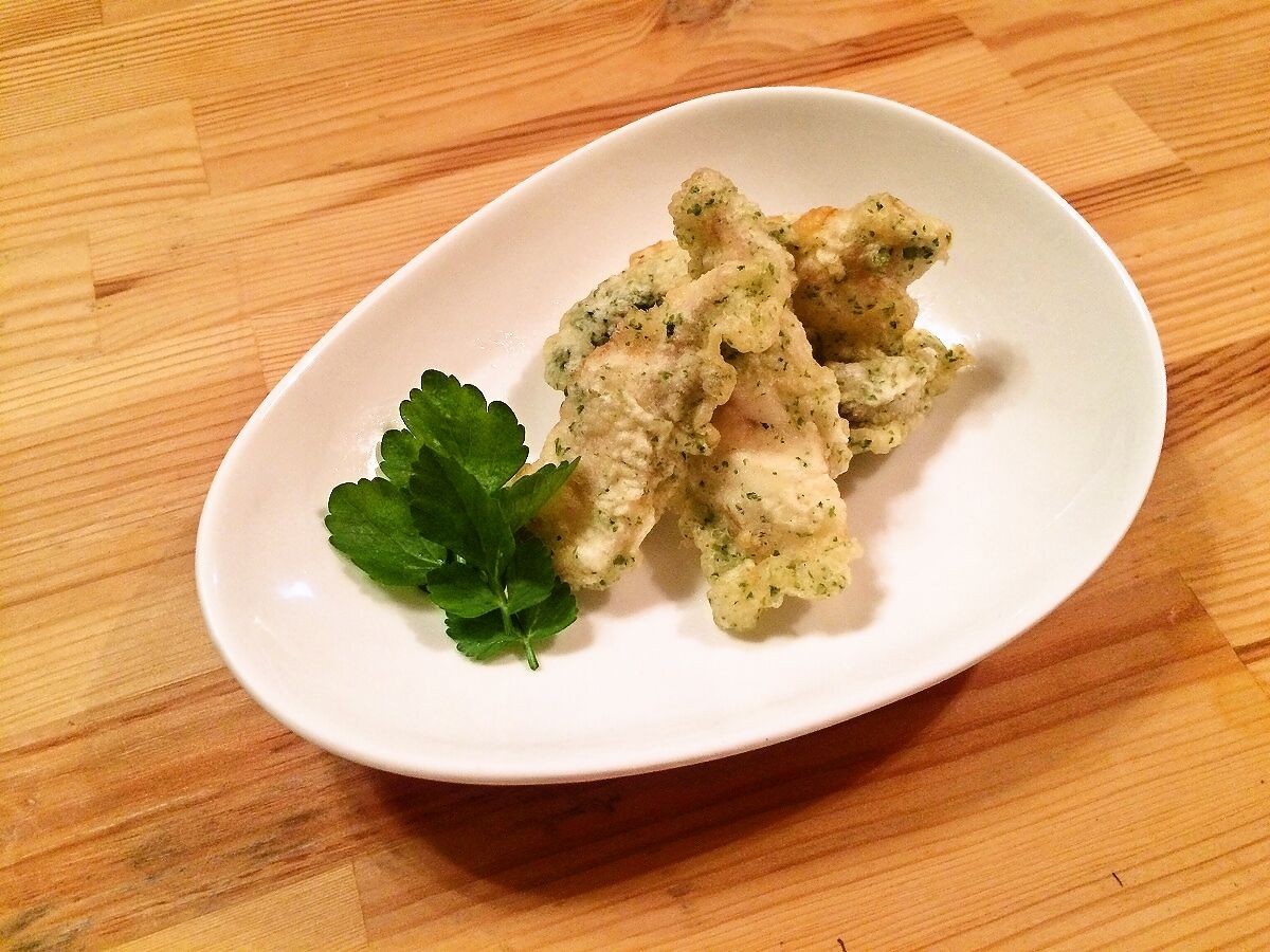 箸休めにヒラスズキの天ぷら!この時は青のりを忘れませんでしたv( ̄∀ ̄)