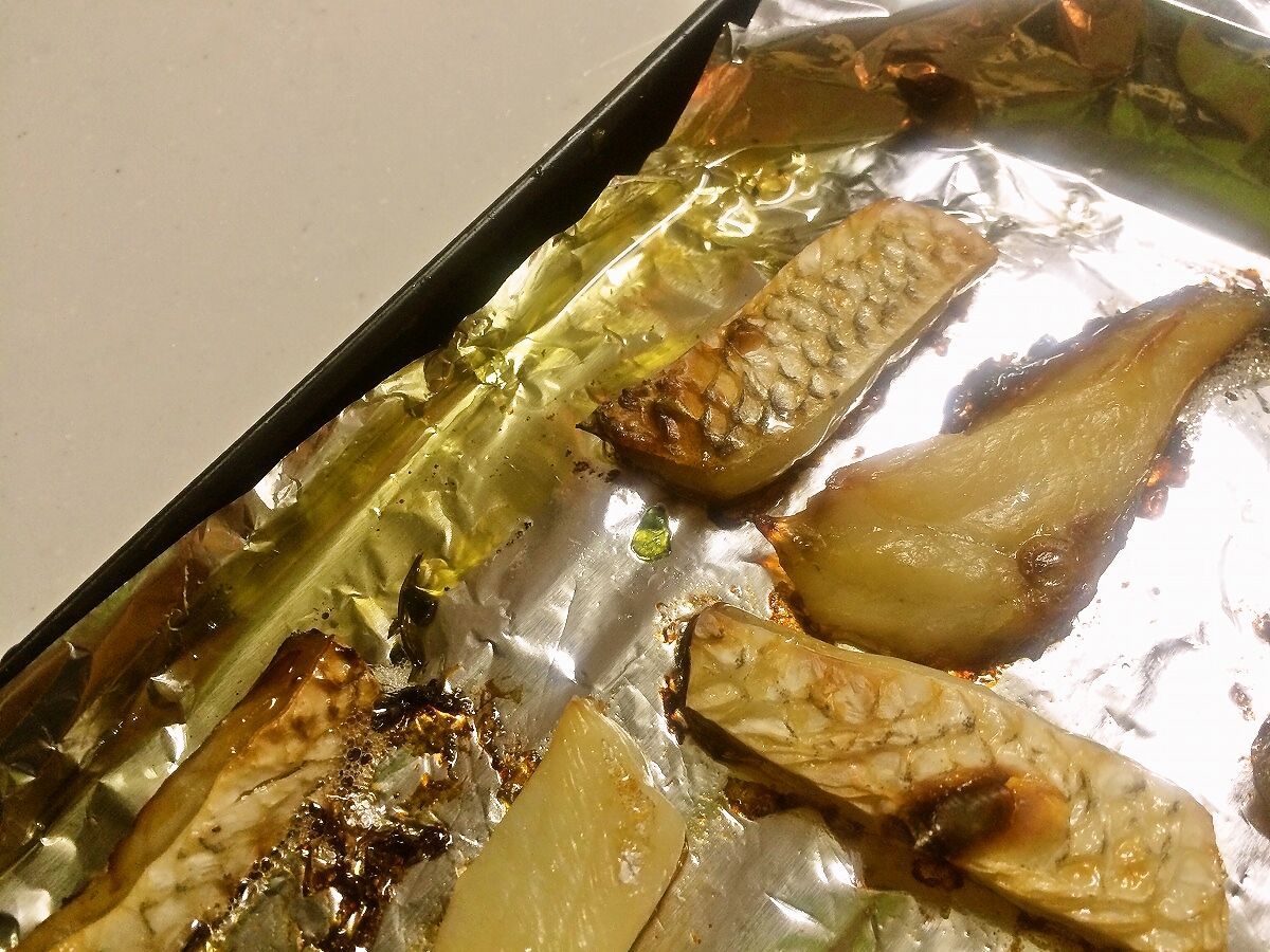 トースターで焼いていたら、脂がノリノリのヒラスズキからは魚油でも作れそうなほどの大量の油が出ていました(゜ロ゜)!!