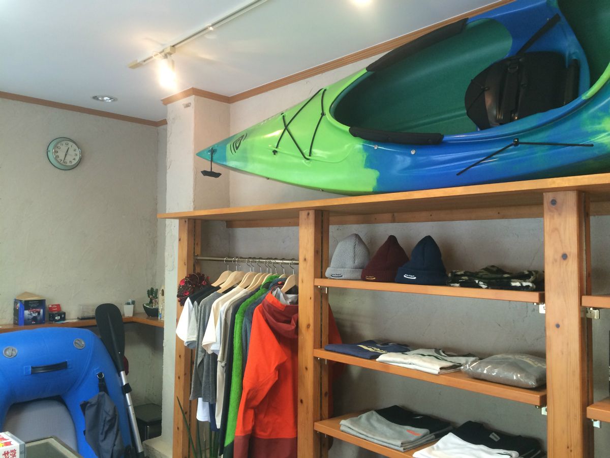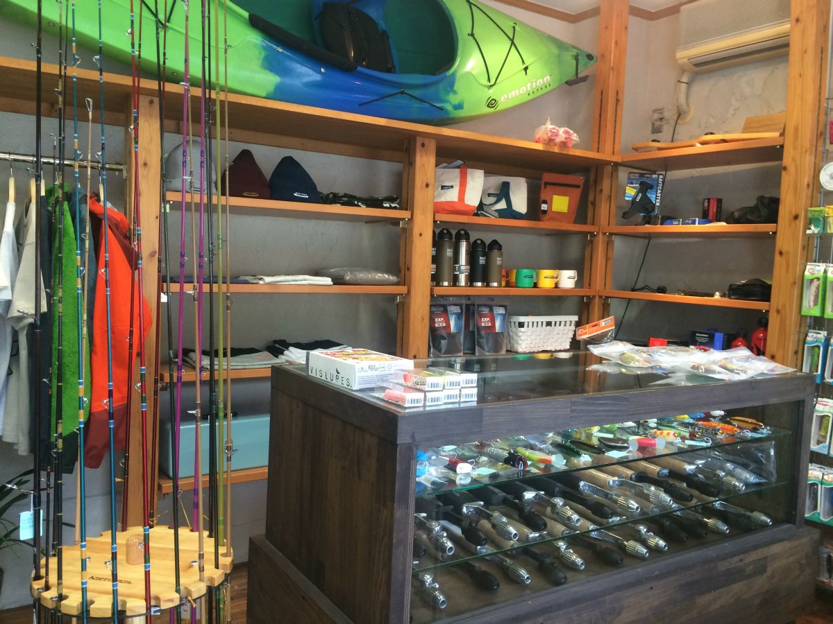 店内には木下さんのカヤックやアパレル製品、ご自身で必要性を実感されて仕入れている防寒着など、実用的なラインナップが揃う奥の棚の手前には、遊び心満載のトップウォーター用のルアーが(´∀`)ワクワク
