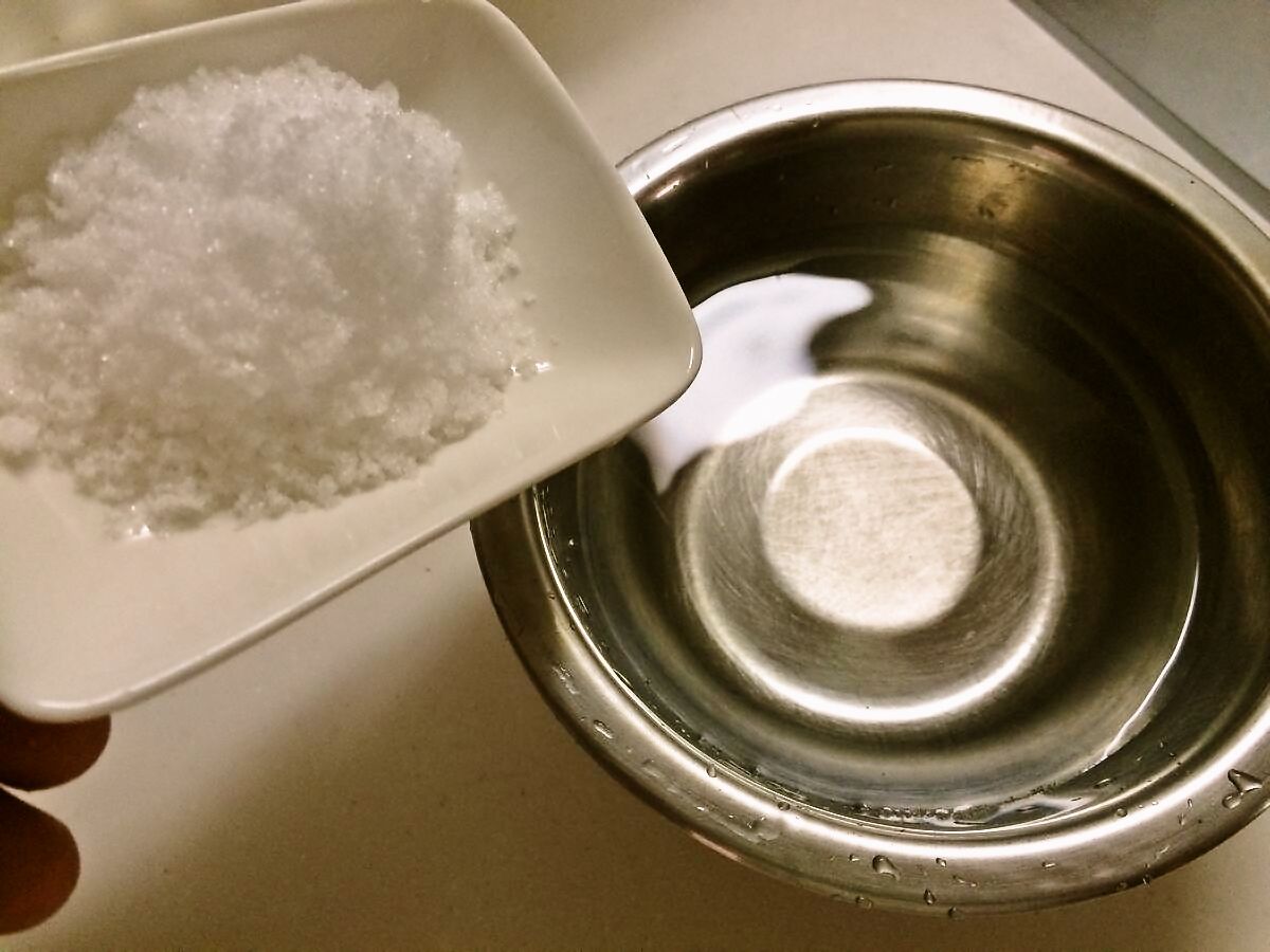1.水に塩を投入して塩のかけらがなくなるまで混ぜ続けます。(1分位混ぜました(´A`;)