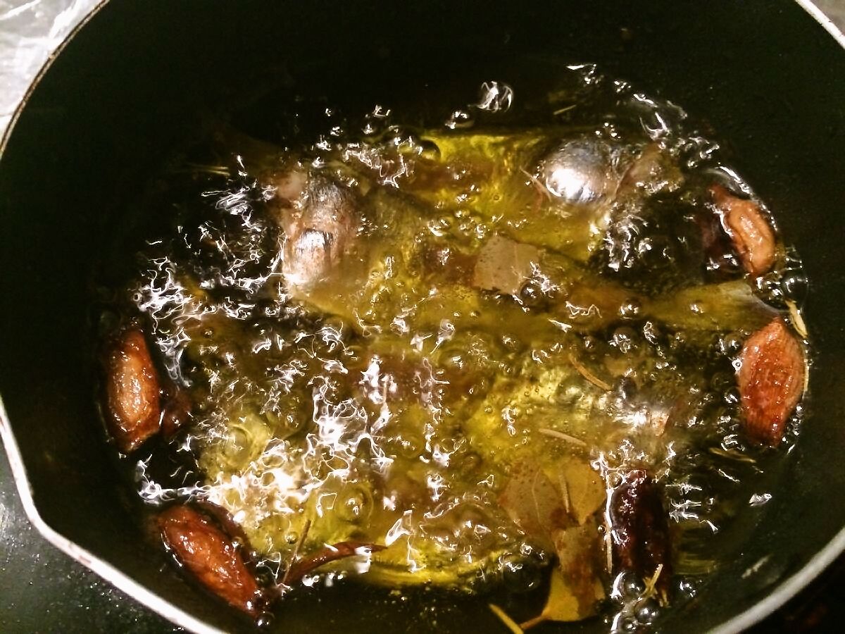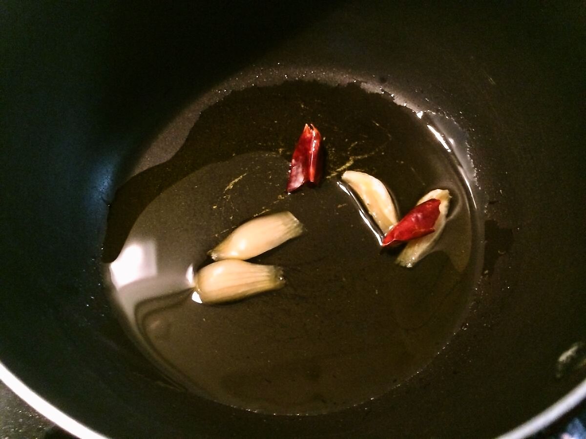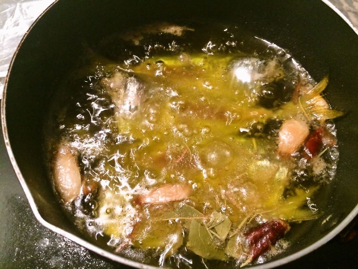 3.漬け込んでいる間の時間を利用して、少量のオリーブオイルでニンニクと鷹の爪を弱火で炒め、油に香りを移します。15分位炒めたら火を切って香油にも休憩時間を与えます∩(´∀`)∩