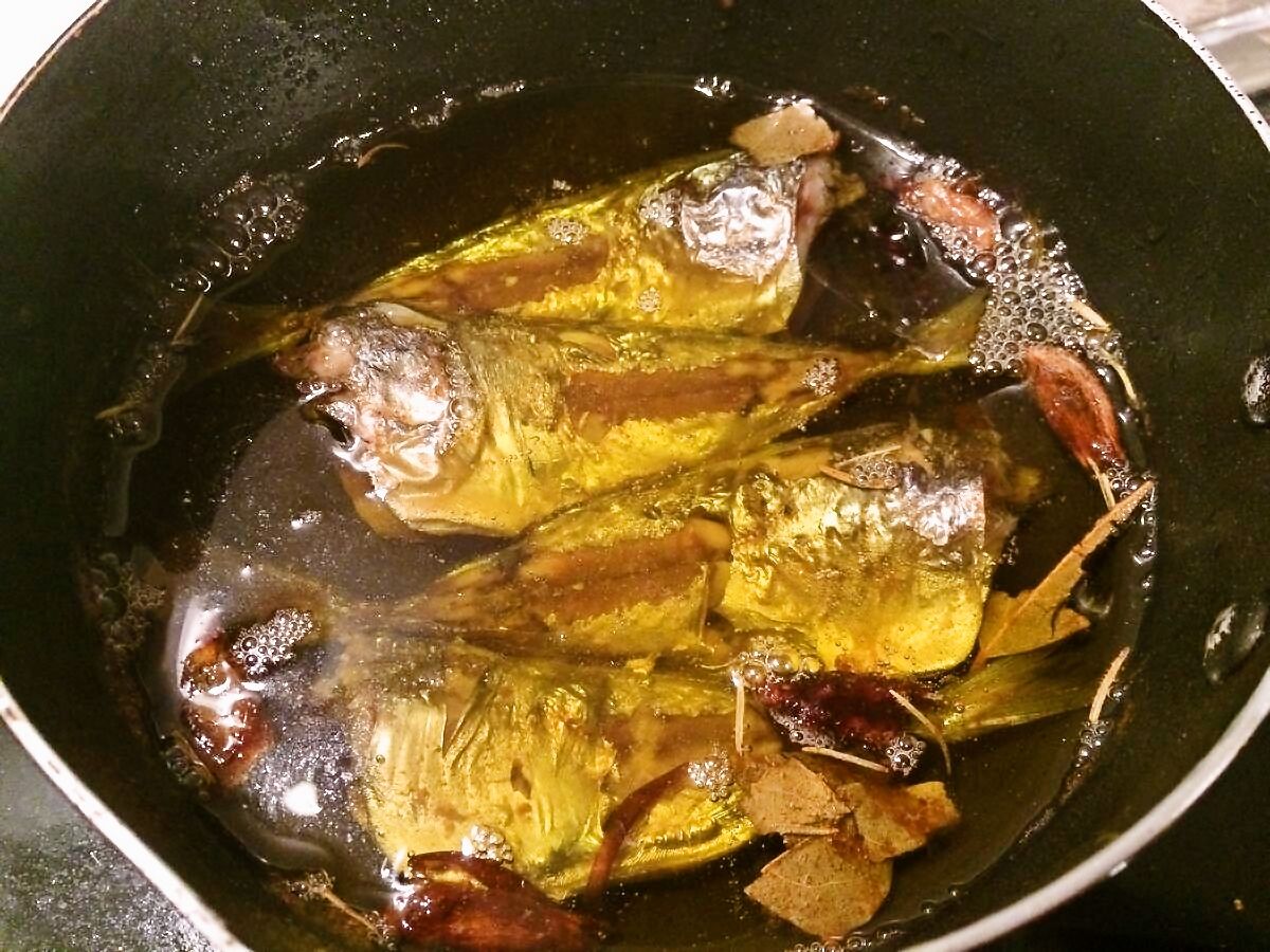 6.炒めていたニンニクと鷹の爪をいったん取り出し、シャキッとさせたアジを調度良いサイズのフライパンに並べ、参考にしたサイトに記載されていた通りオリーブオイルをヒタヒタになるまで注ぎ、その上にニンニク、鷹の爪、ローズマリーをパラりと、ローリエを小さく切ってセンターに配置します⊂(・∀・)オッス