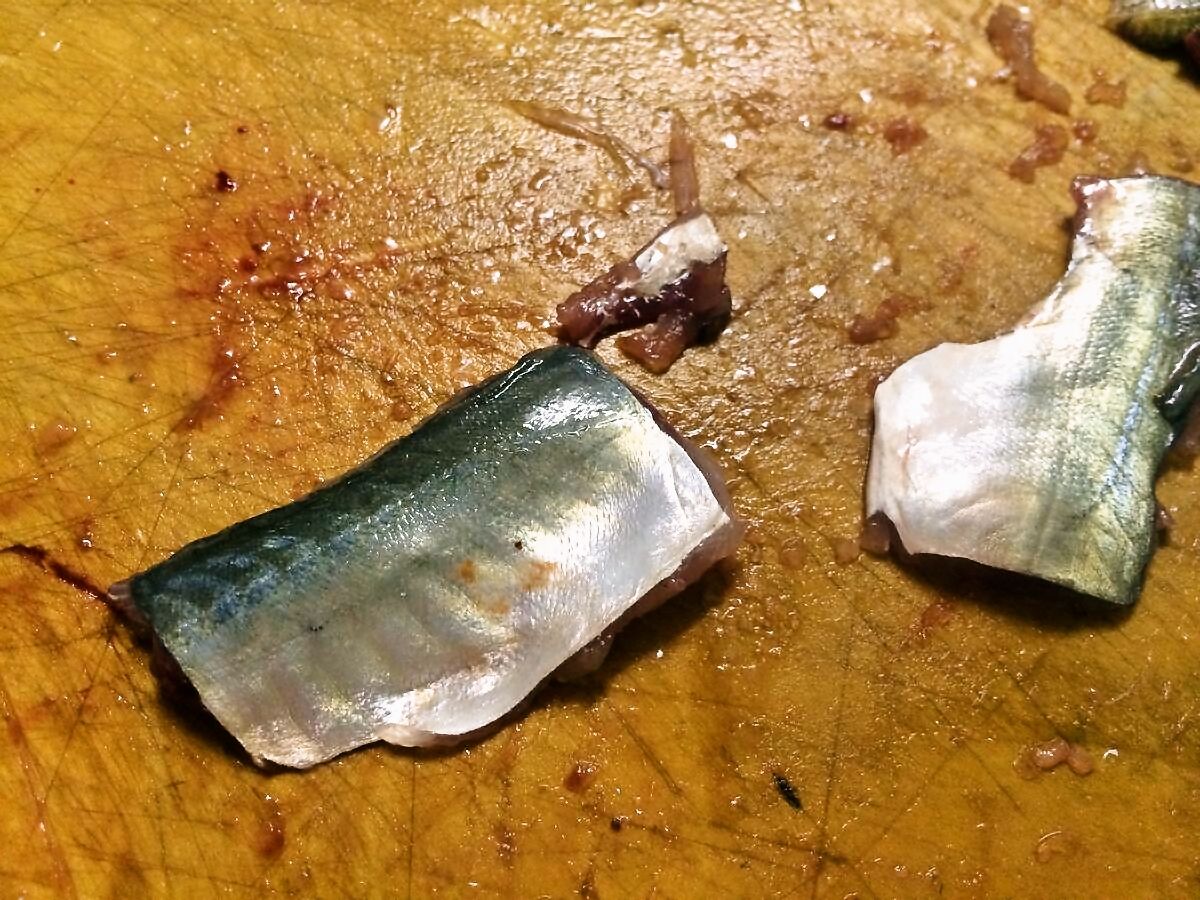 ちょっと処理に失敗したアジの肉片が出来たら、そのまま醤油をかけてつまみ食いしたいキモチをグッとこらえて、、、