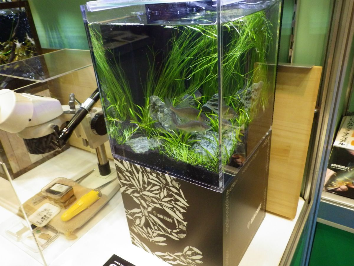 ガンクラフトから発売されて話題になった水槽「クロスミニ」が展示されていました。