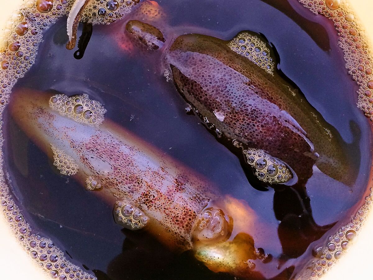 アオリイカの新子を麺つゆに投入すると、麺つゆを飲んでパンパンに膨れる新子(上)と、すでに息絶えて変化なしの新子(下)。体中に麺つゆのダシが回っているであろう膨れた新子の方が圧倒的に美味しそう(*´艸`*)