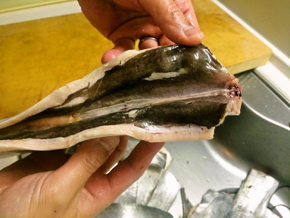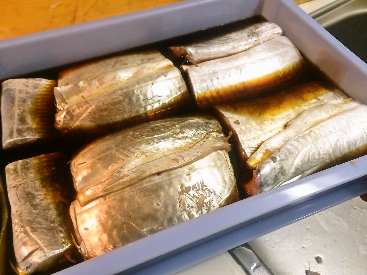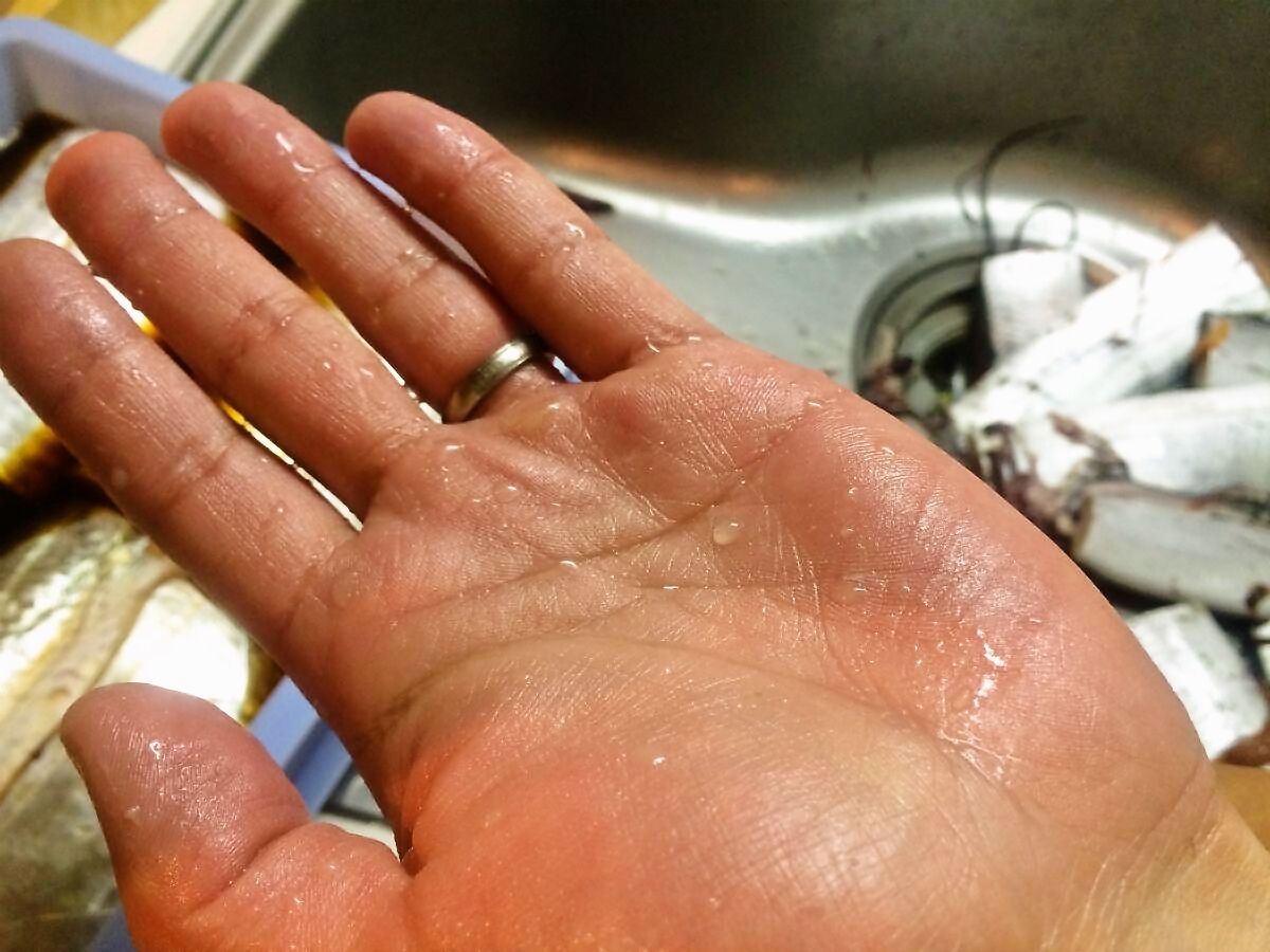 捌き終わったところで手がニュルニュルに。流石越冬前の魚、脂が乗りまくっています(*´ω`*)♪ 手相占いはしないでくださいね。
