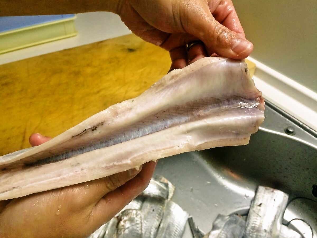 背中からV字型に包丁を入れて背骨を抜くと調理し易いのですが、数が多かったので一文字殺法で一気に切りましたヽ(゚д゚)ウリャ-