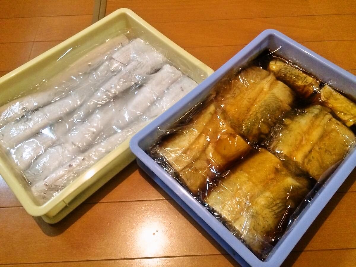 漬け込んだ干物のネタ。干物作りもずいぶん慣れて来ましたが、まだまだ勉強は尽きません。居酒屋村上では 漬込み三年、干し八年、焼き一生 と言われるほど干物は奥深いものなのです。