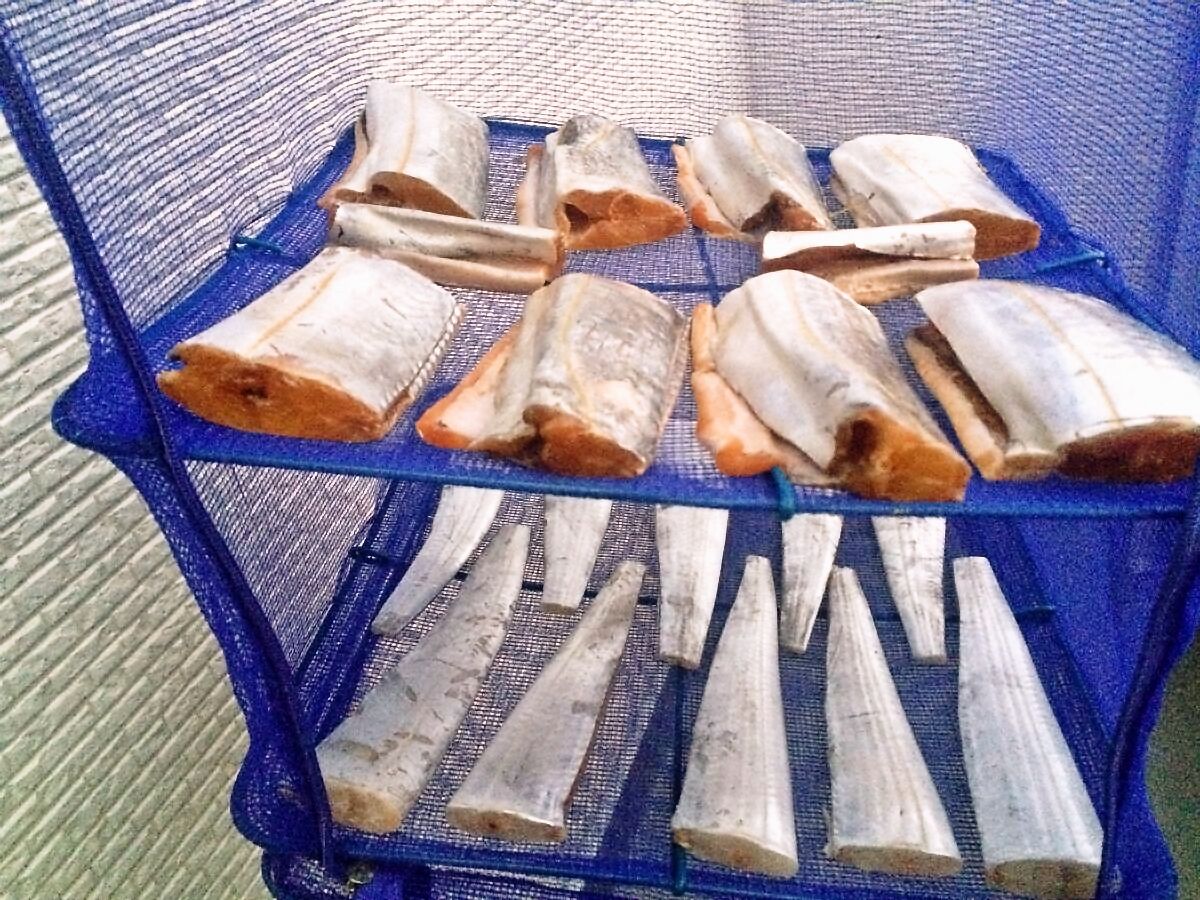 まずは細すぎて食べられない尻尾の部分を落とし、もう少し細い尻尾の部分を干物用にカット♪