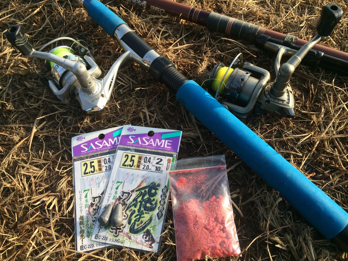 今回もレジャーフィッシングセットを用意、バス釣り以外のショアの釣りは大体これで事足ります。仕掛けは「ササメ 飛ばしワカサギ(針2.5号)7本針」を使用。