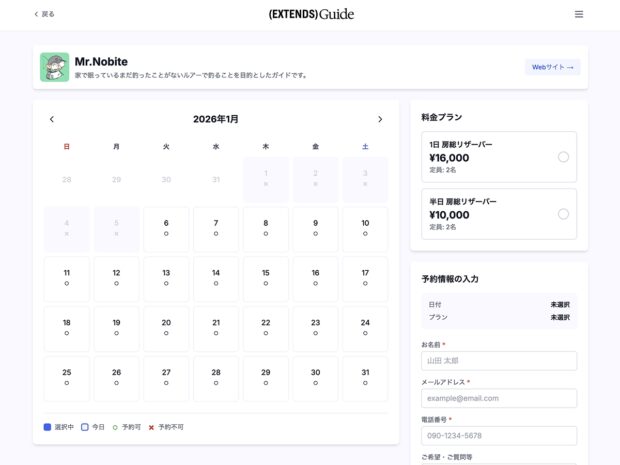 続いて釣りガイドさん向けの予約管理システムです。電話やDMでのやり取りって、ガイドさんも釣り人もお互い大変ですよね…そこをスムーズにできないかなと。