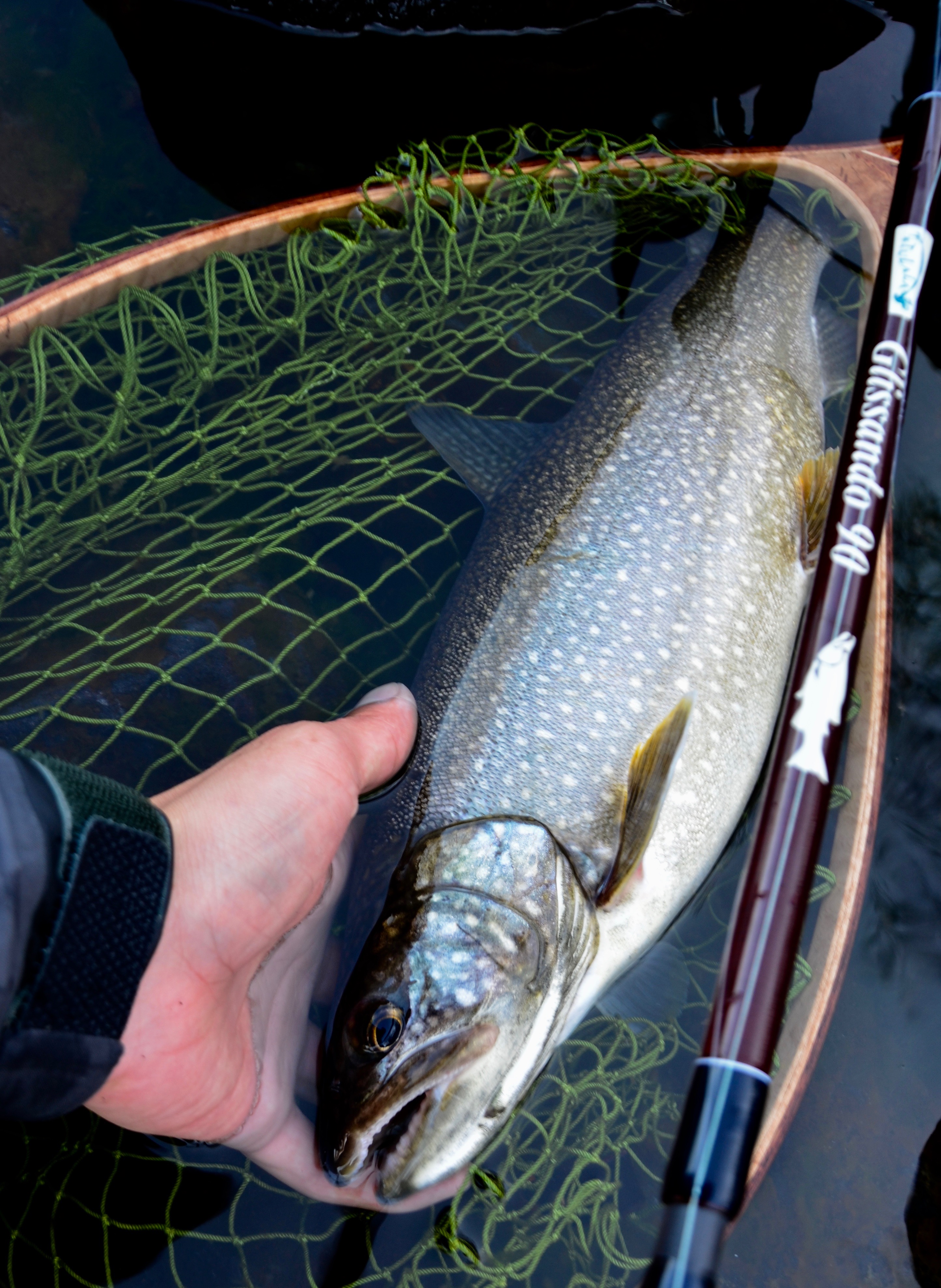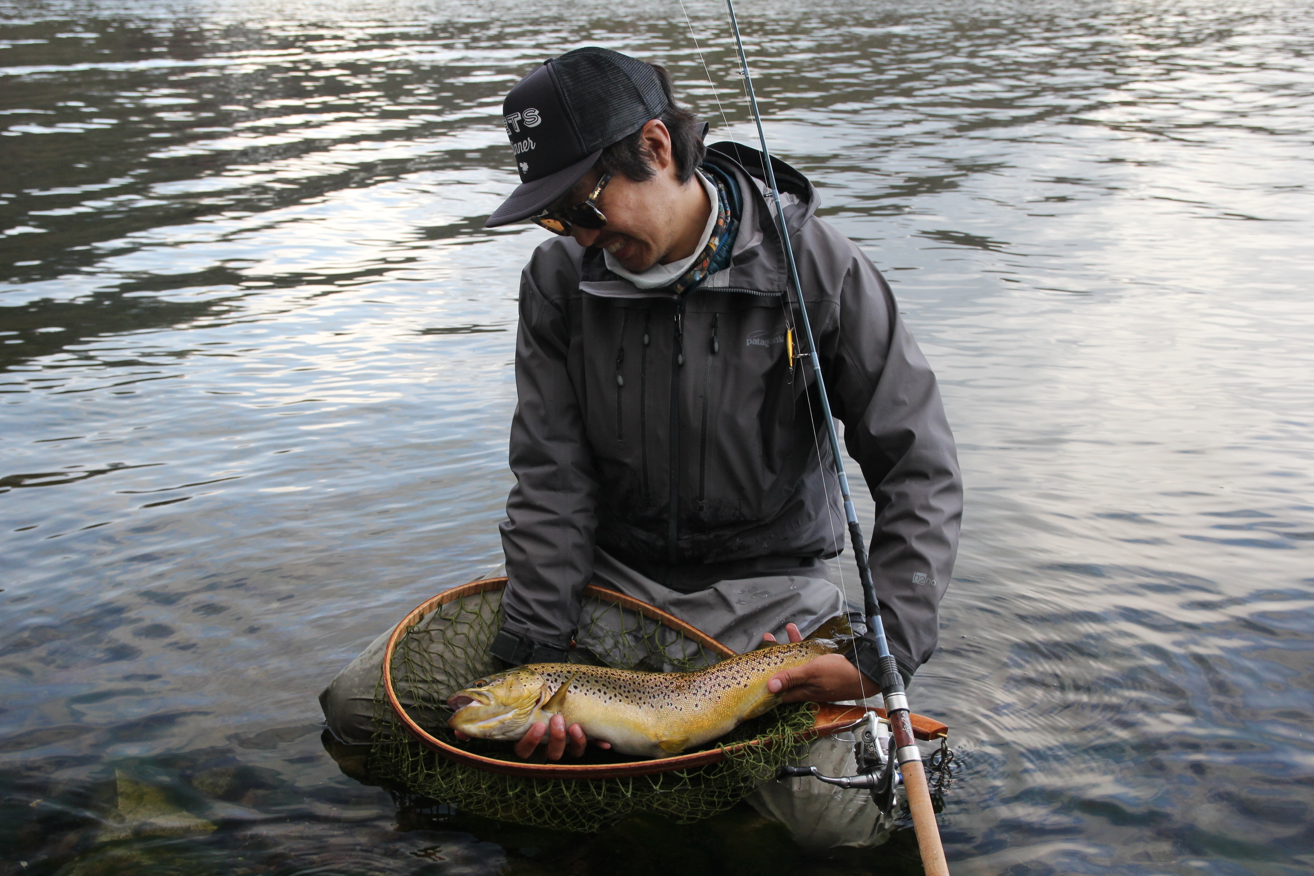 管釣りルアーなのでもちろんフックはシングルバーブレス、しかも細軸。早くランディングしたい衝動を必死に抑えながら慎重にファイトし、やっとネットに滑り込んだ魚は58.5cm(60cmいったかと思ったので何度も測ったため正確…)、回遊しているタイプとはまた違った黄金色の体躯にしばし見とれるのでした。サプライズ!
