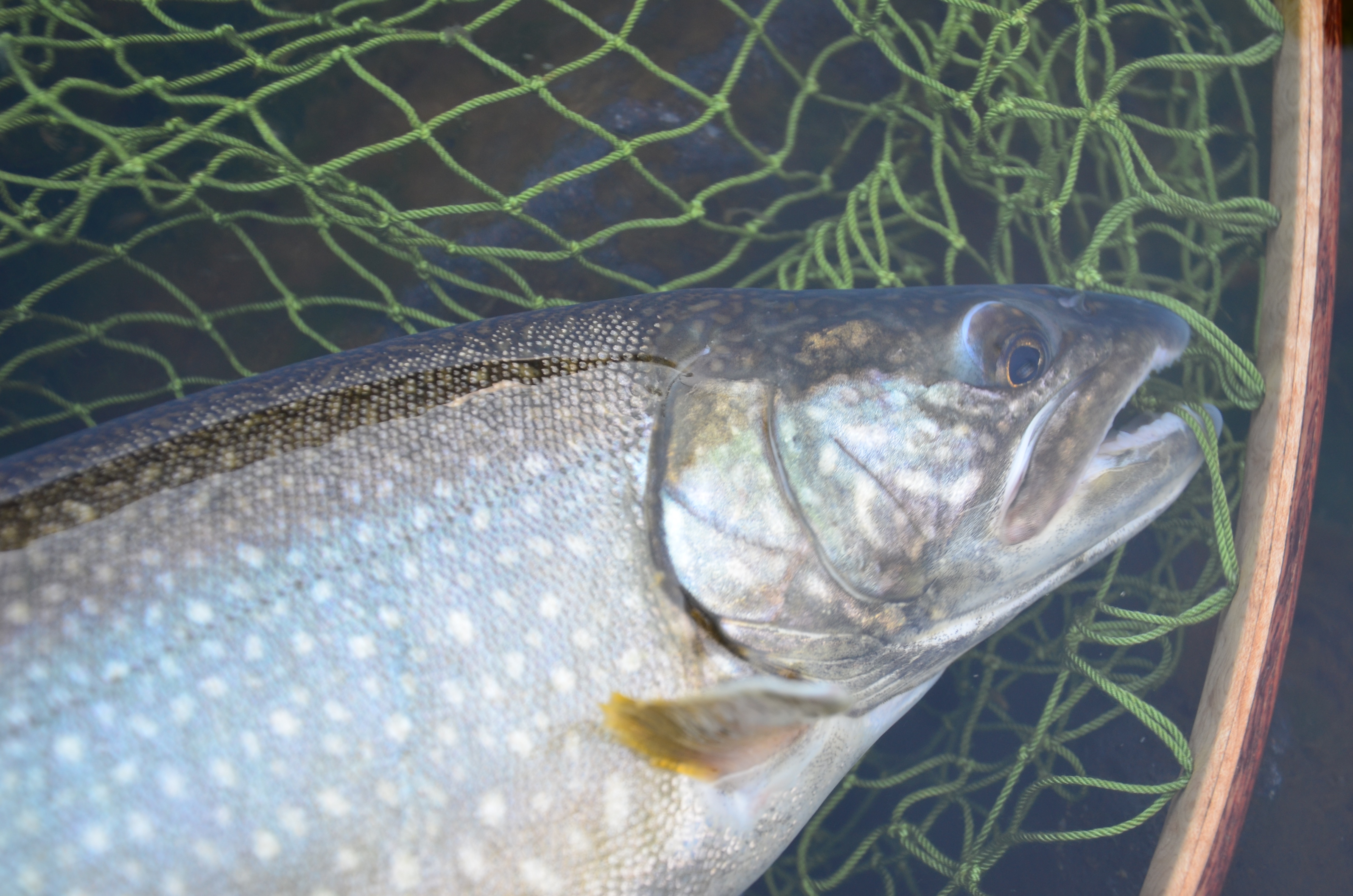 太陽が昇る頃、まずその姿を見せてくれたのは50cmジャストぐらいのレイクでした。沖のディープから感じ取るアタリ、そしてフッキングで重みが乗った瞬間にはまだサイズが読めないスプーンの釣り。毎回この瞬間はドキドキするものです。あまり大きな魚ではありませんが、ワカサギを飽食しているらしくスタイルは抜群。黒ずんだ首元が何とも野性的でゾクゾクするのですが、この手の話はあまり人に理解されません…