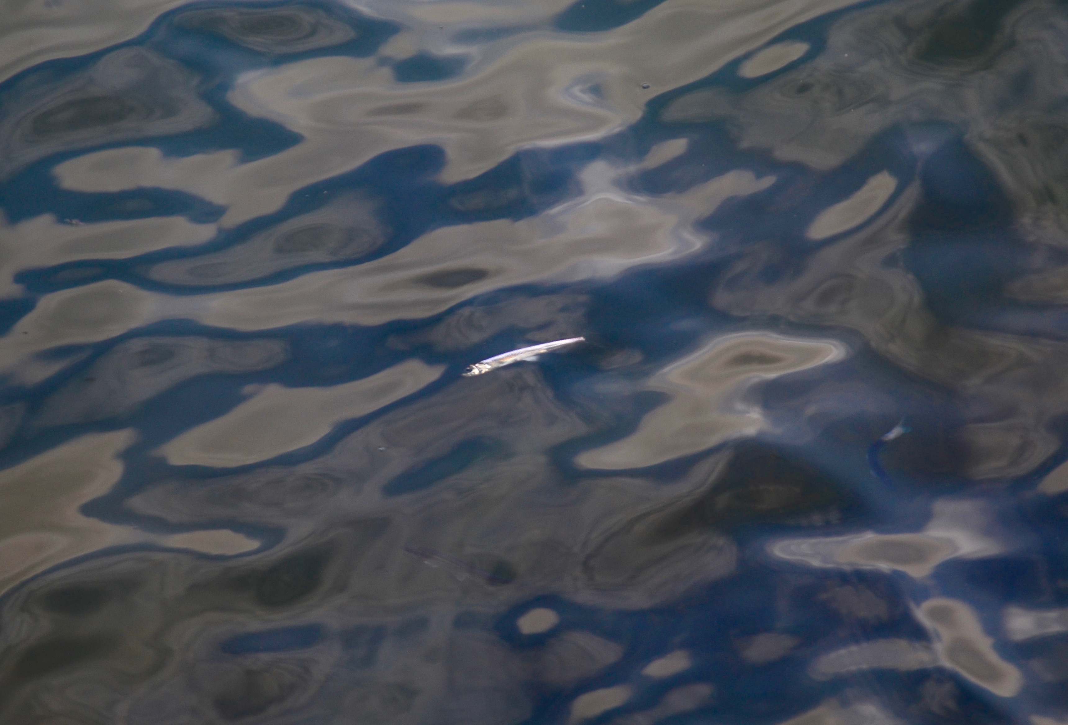 そこで車に積んであった管釣りタックルボックスから5cmクラスのミノーを取り出し付け替えます。ボイルしている少し沖目に投入し、糸ふけを取りながら小さなルアーの位置を確認。カラーはクロキンなのでまあまあ見づらい(笑)