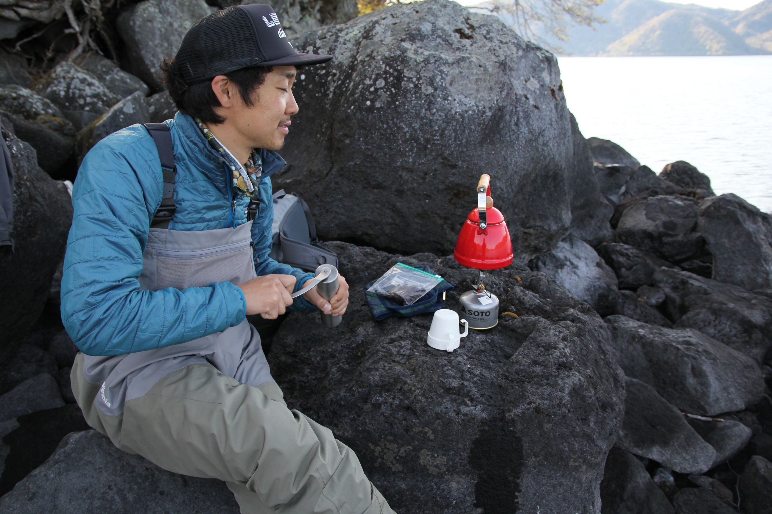 ひとまず魚は触ったし、ポイントを休める意味でも休憩は大切なので、ここでコーヒーブレイク。いつもではないのですが、この日は良い豆が手に入ったので、コーヒーミルも持って行き湖畔で豆を挽くところからスタート。実はこの時間がこの釣りの一番の魅力でもあります。釣れてない時こそ余裕を持つこと。実は去年も今年も大型が釣れたのはコーヒーの直後なので、そんなイメージが刷り込まれているのかもしれませんね。